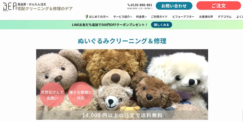 「クリーニングのデア」は、修理・補修・綿入れにも対応したぬいぐるみ専用の宅配クリーニングです。